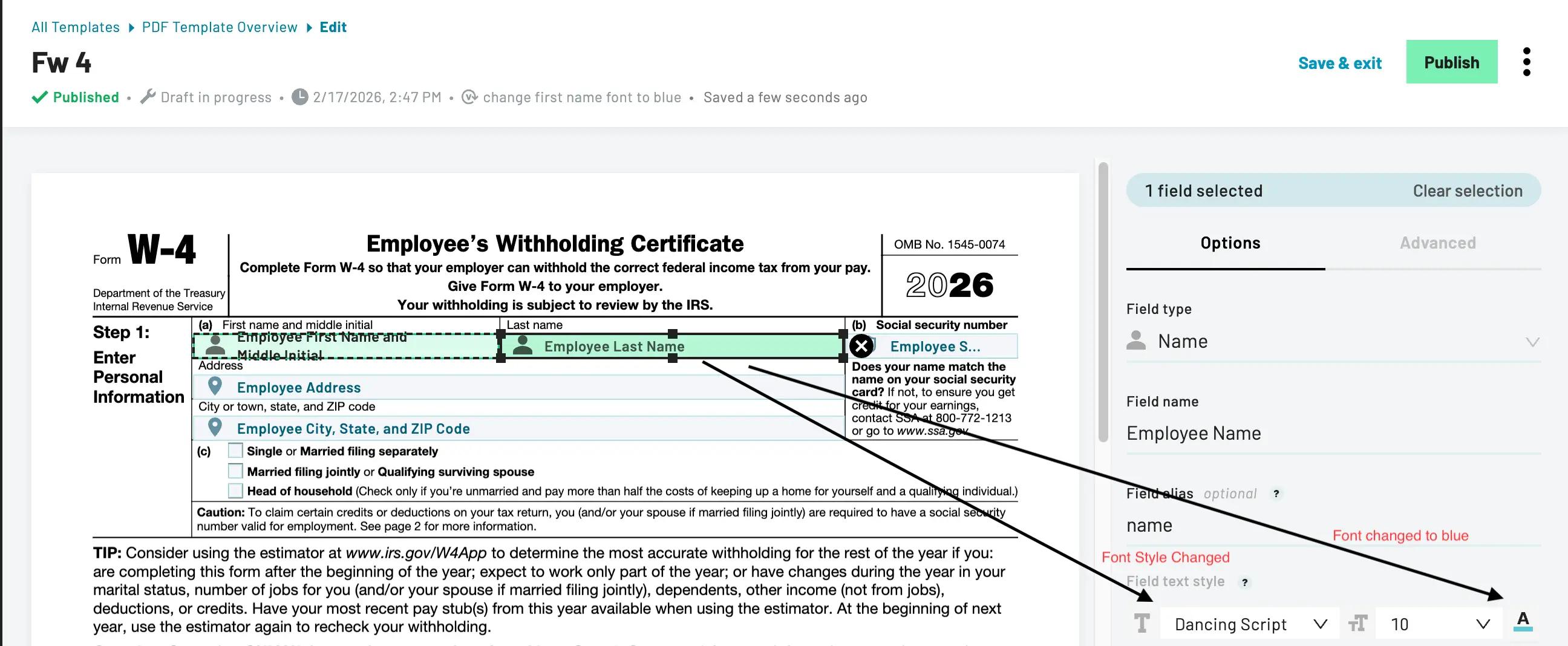 For example, this template has unpublished font styling changes (changed employee last name to have a blue font and a different font style):