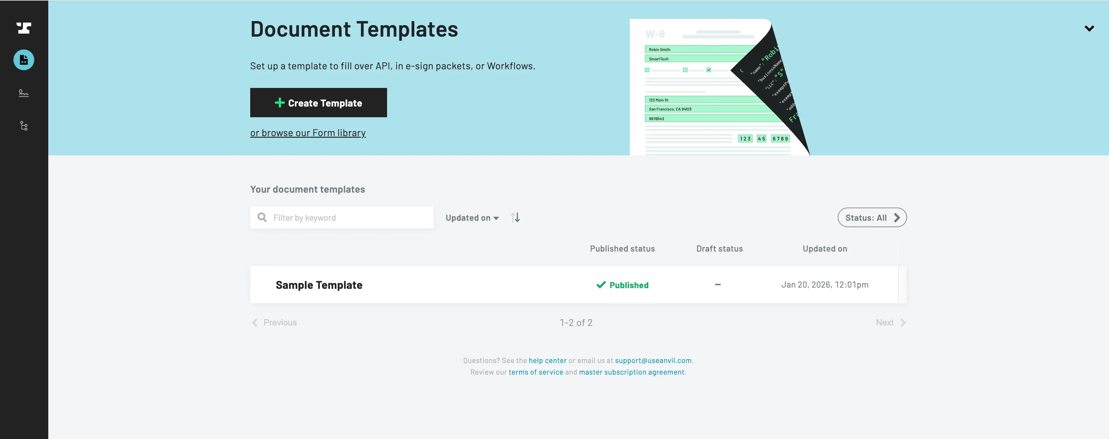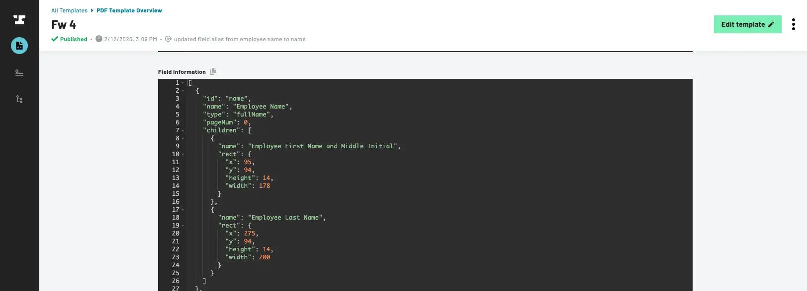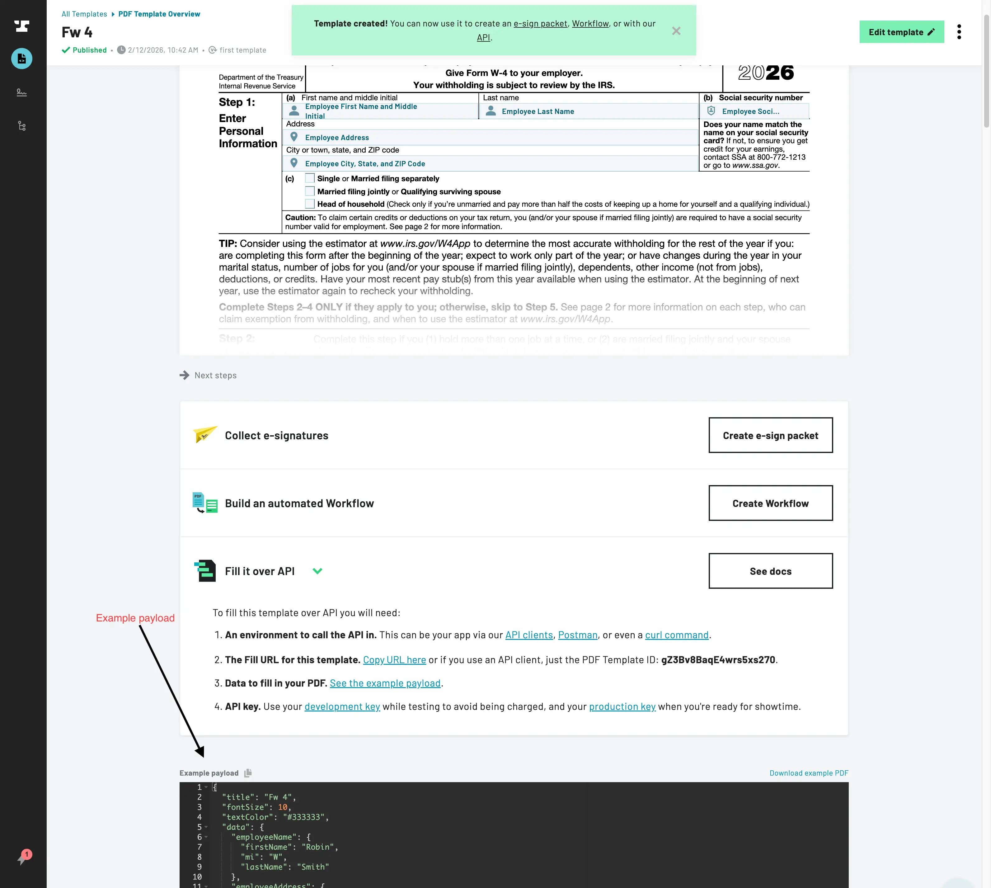 When you finish editing fields and publish the PDF, you are taken to the Document Template dashboard. From there, click on the template that you want to add data to. It shows everything you need to fill the template with the API, including an example payload to quickly get started.