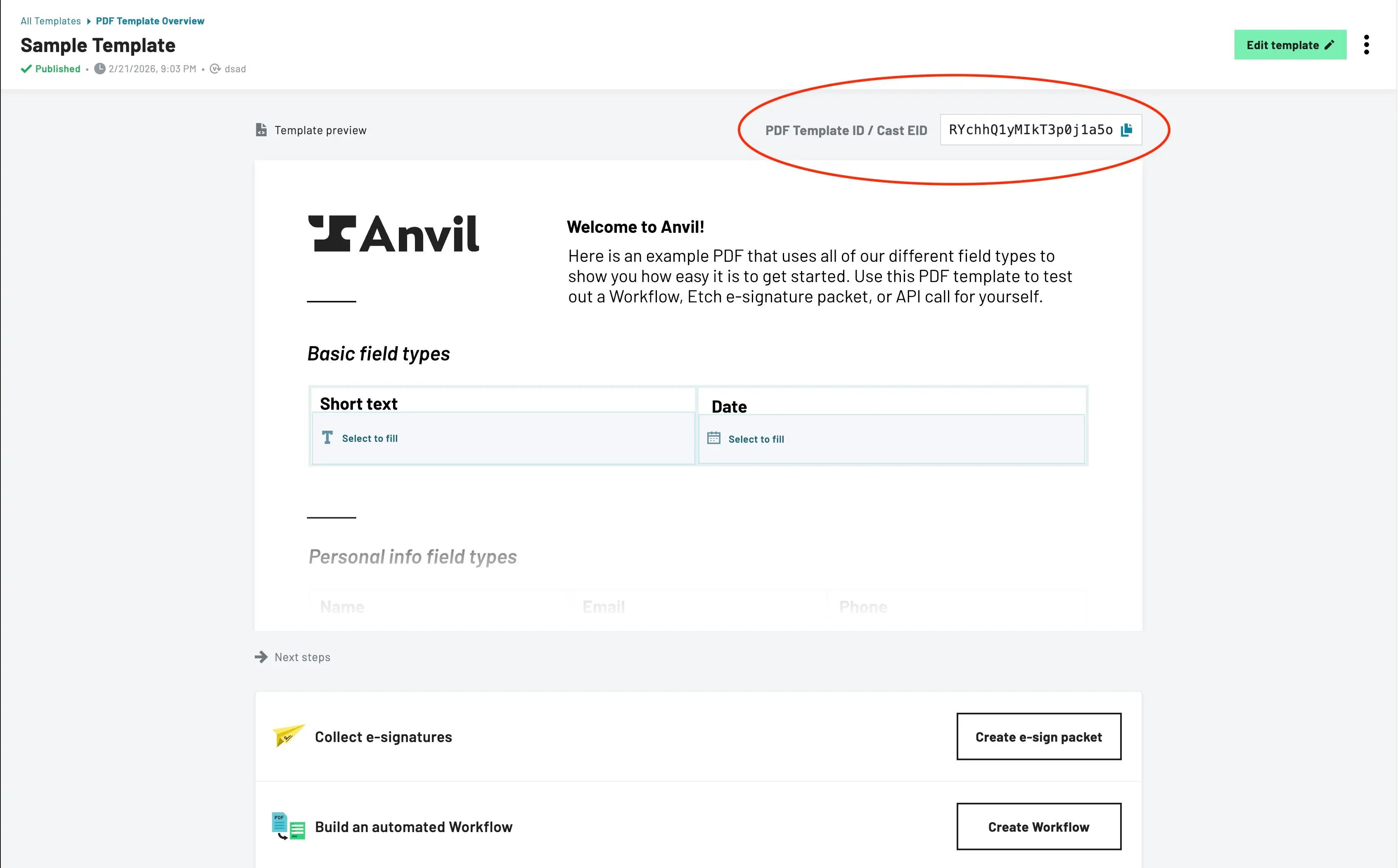 To find your PDF template's POST URL, go to the PDF template page in Anvil (the path is /org/<your org slug>/pdf/<pdf template id>). Click copy on the PDF Template ID / Cast EID button: