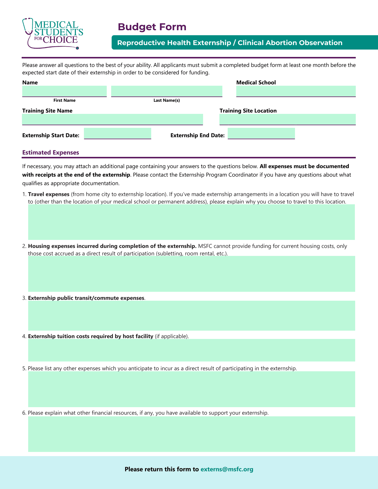 Budget Form Reproductive Health Externship Clinical Abortion Observation