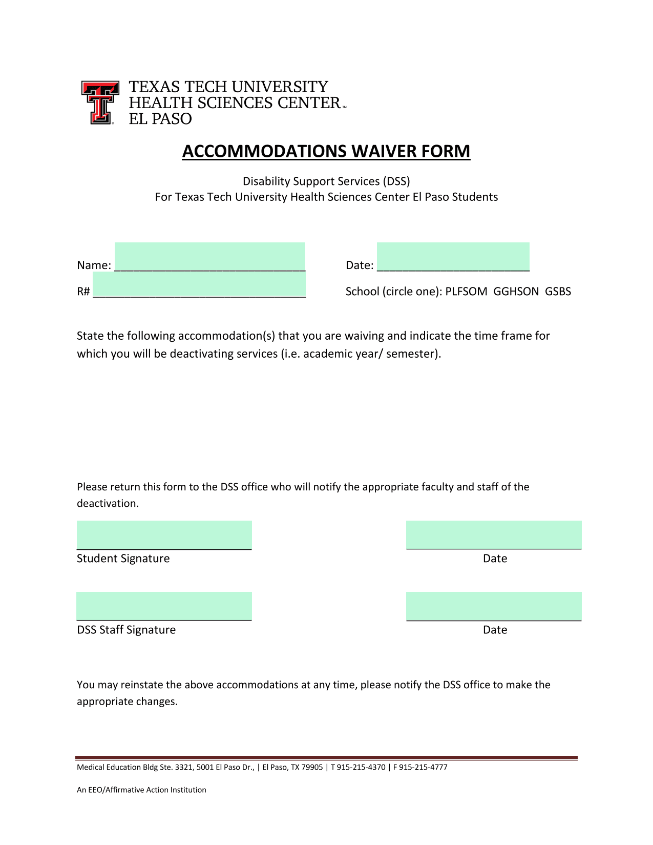A form for students at Texas Tech University Health Sciences Center El Paso to voluntarily waive existing disability accommodations.