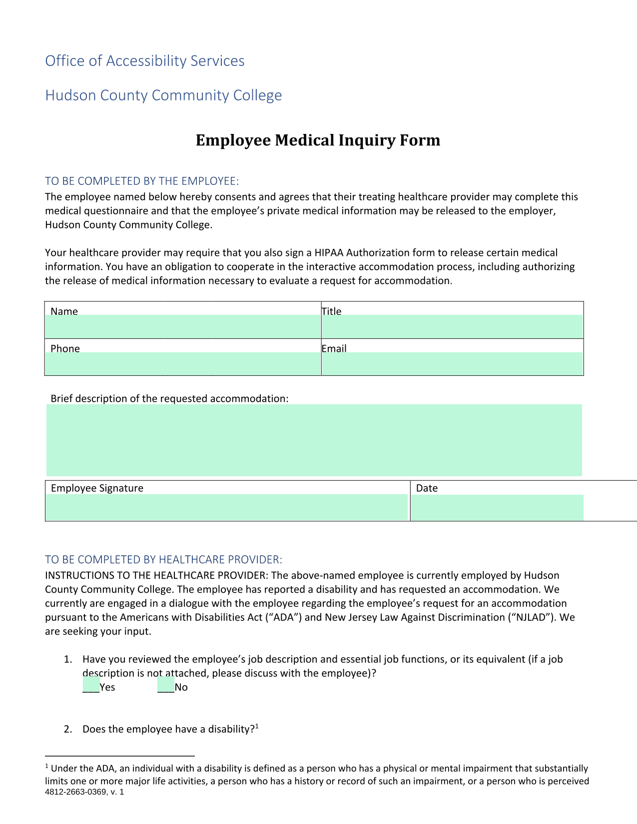 Medical form for employees requesting workplace accommodations, to be completed by both employee and healthcare provider to assess disability and potential workplace adaptations.