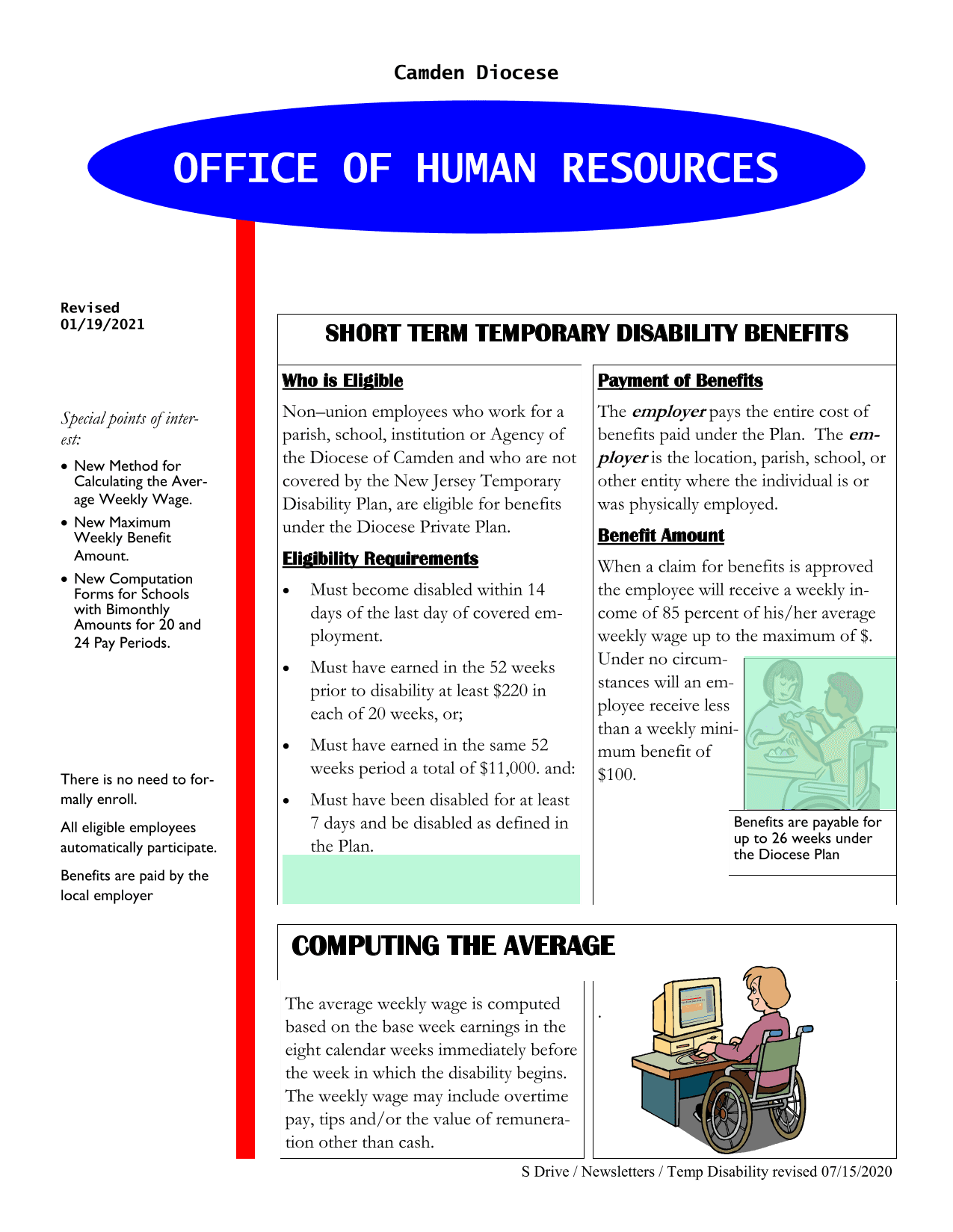 Policy describing temporary disability benefits for non-union employees of the Diocese of Camden, outlining eligibility requirements and benefit calculations.