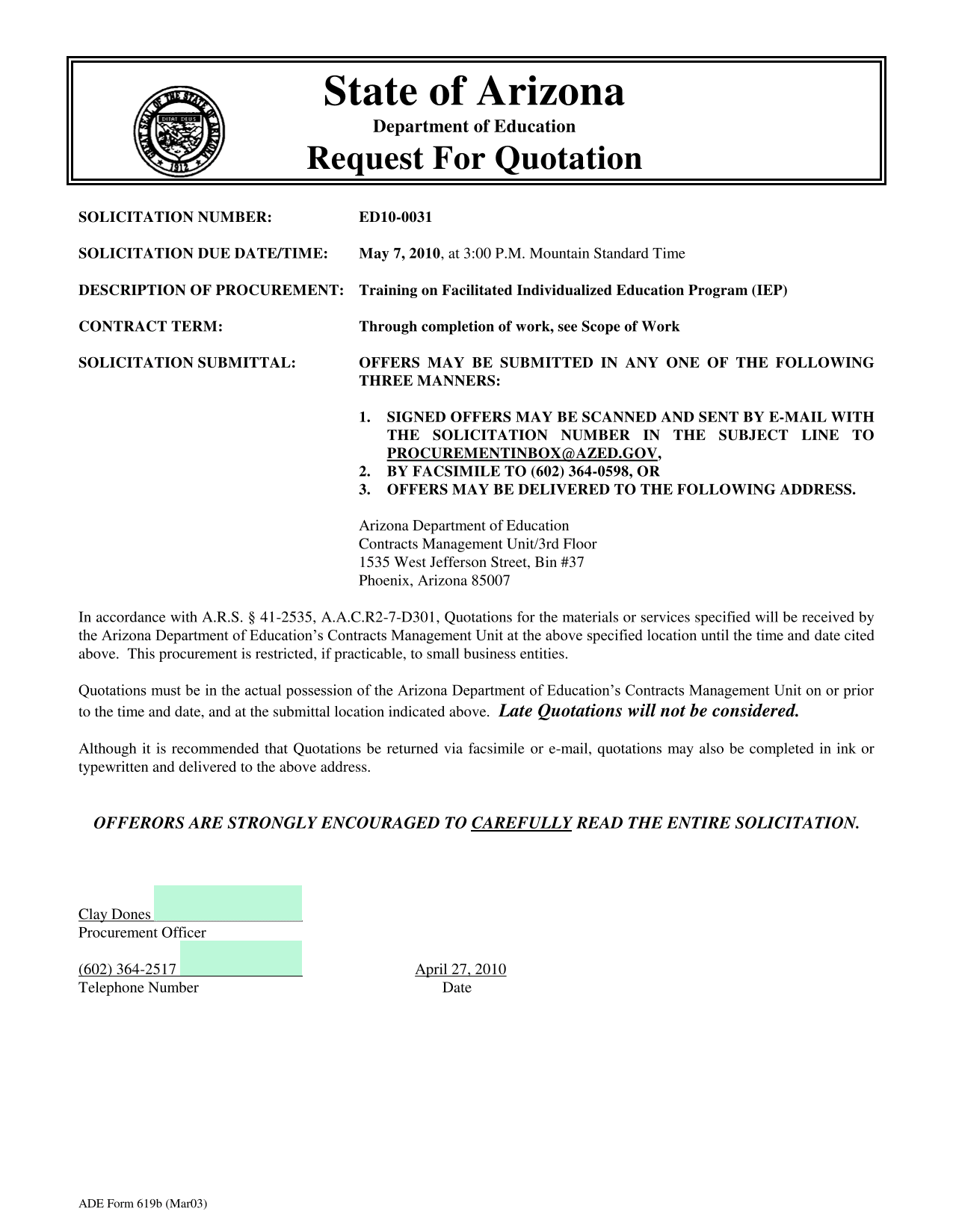 A solicitation by the Arizona Department of Education for training services related to Individualized Education Program facilitation, with submissions due by May 7, 2010.