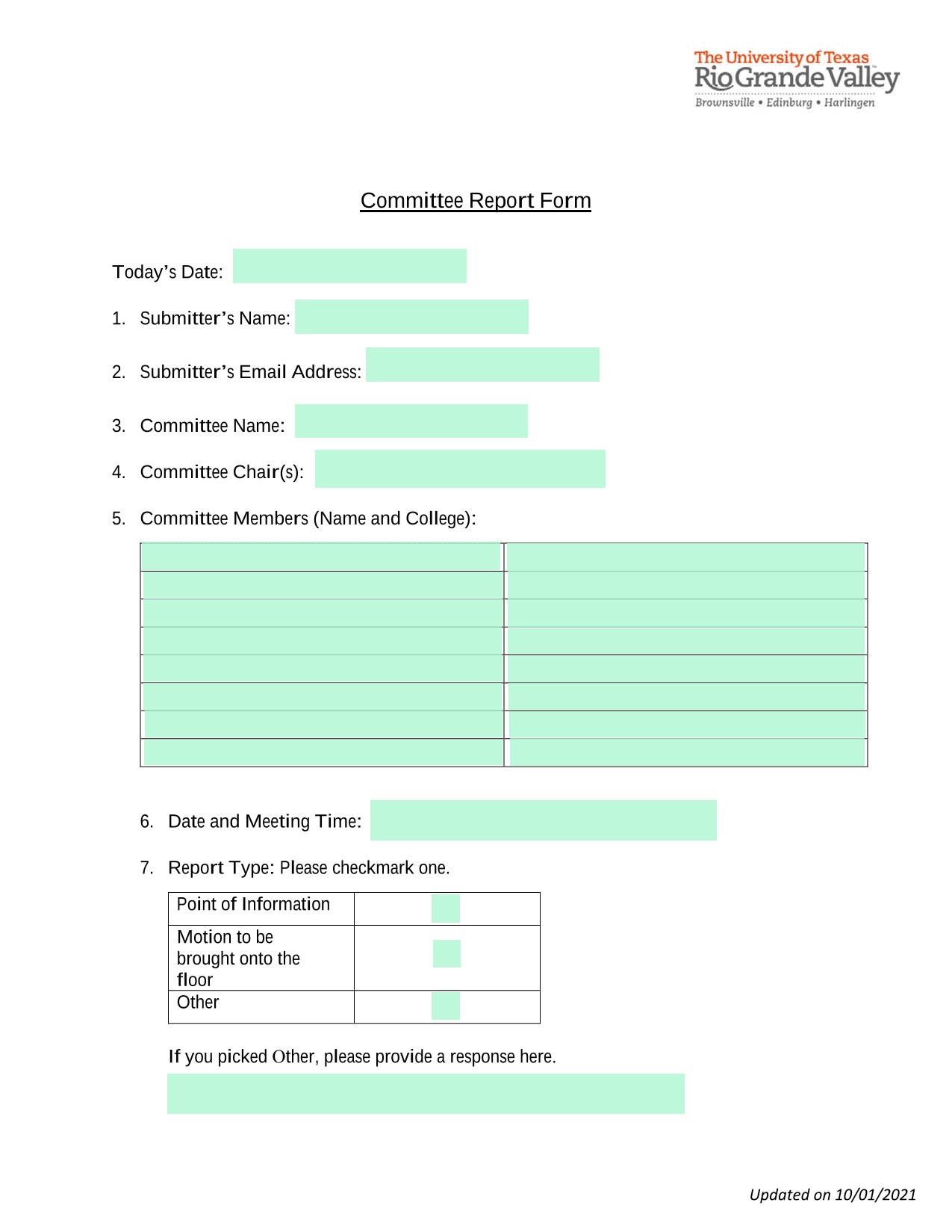 A form for faculty committees to document and submit reports to the Faculty Senate Executive Committee.