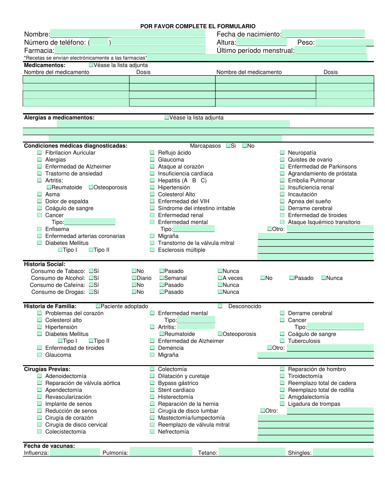 Formulario detallado en espaol para recopilar informacin mdica completa de un paciente, incluyendo antecedentes mdicos, condiciones diagnosticadas y historia social.