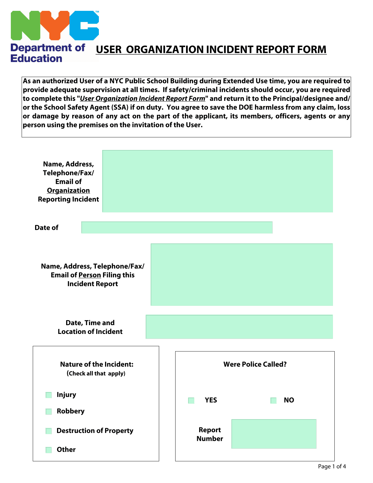 A form for reporting safety or criminal incidents occurring during extended use of a NYC public school building by an authorized user organization.