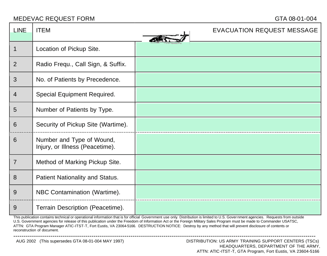 A standardized form for requesting medical evacuation with detailed instructions for field reporting of patient and site conditions.