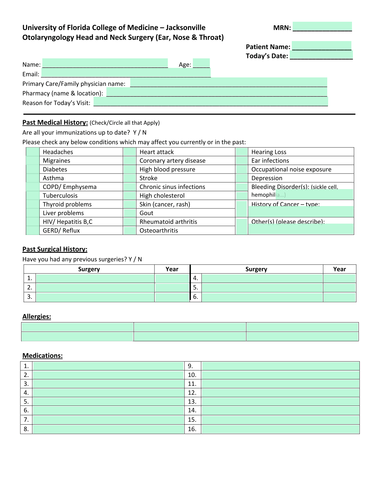 Otolaryngology Head And Neck Surgery Patient Medical History Form