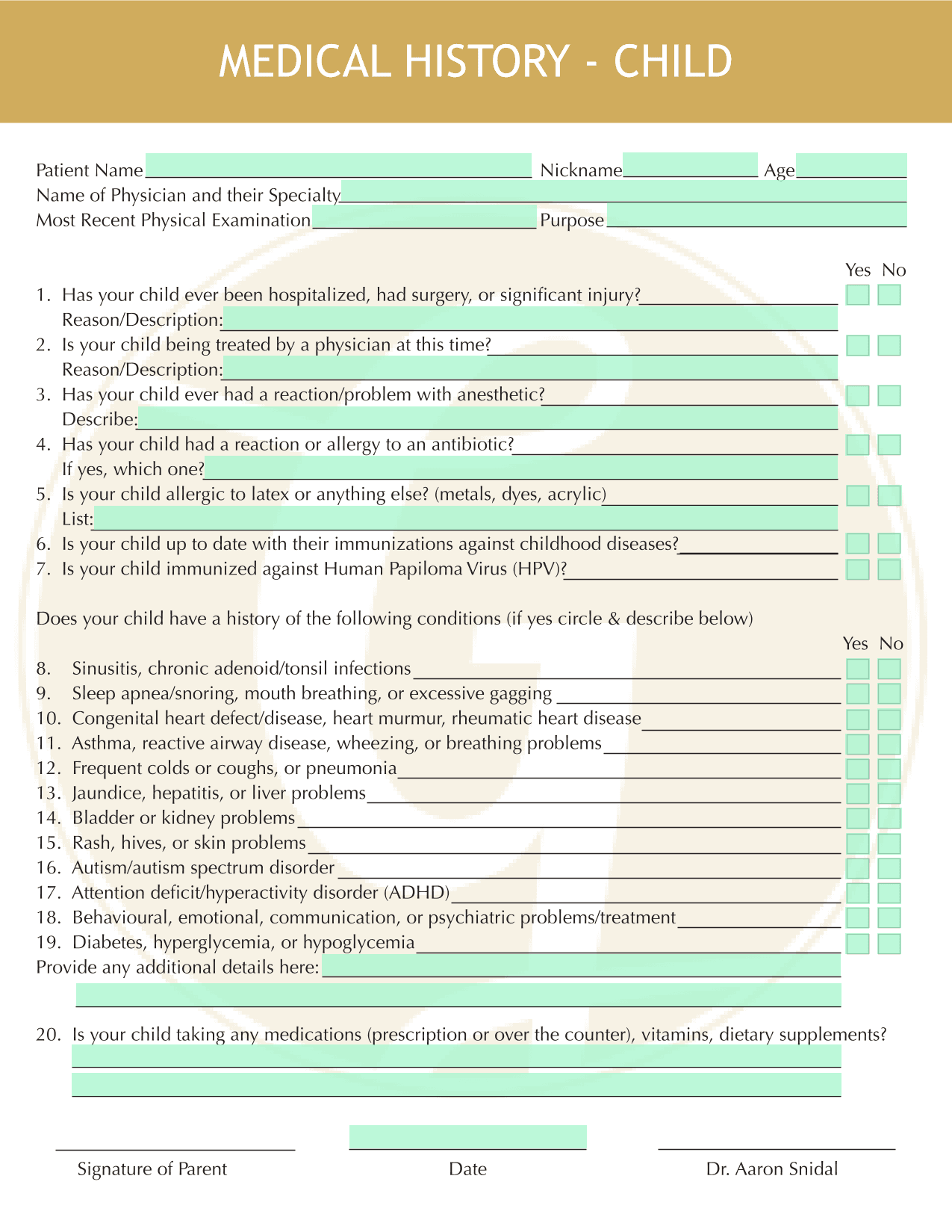 Comprehensive medical history questionnaire for collecting pediatric health information and previous medical conditions.