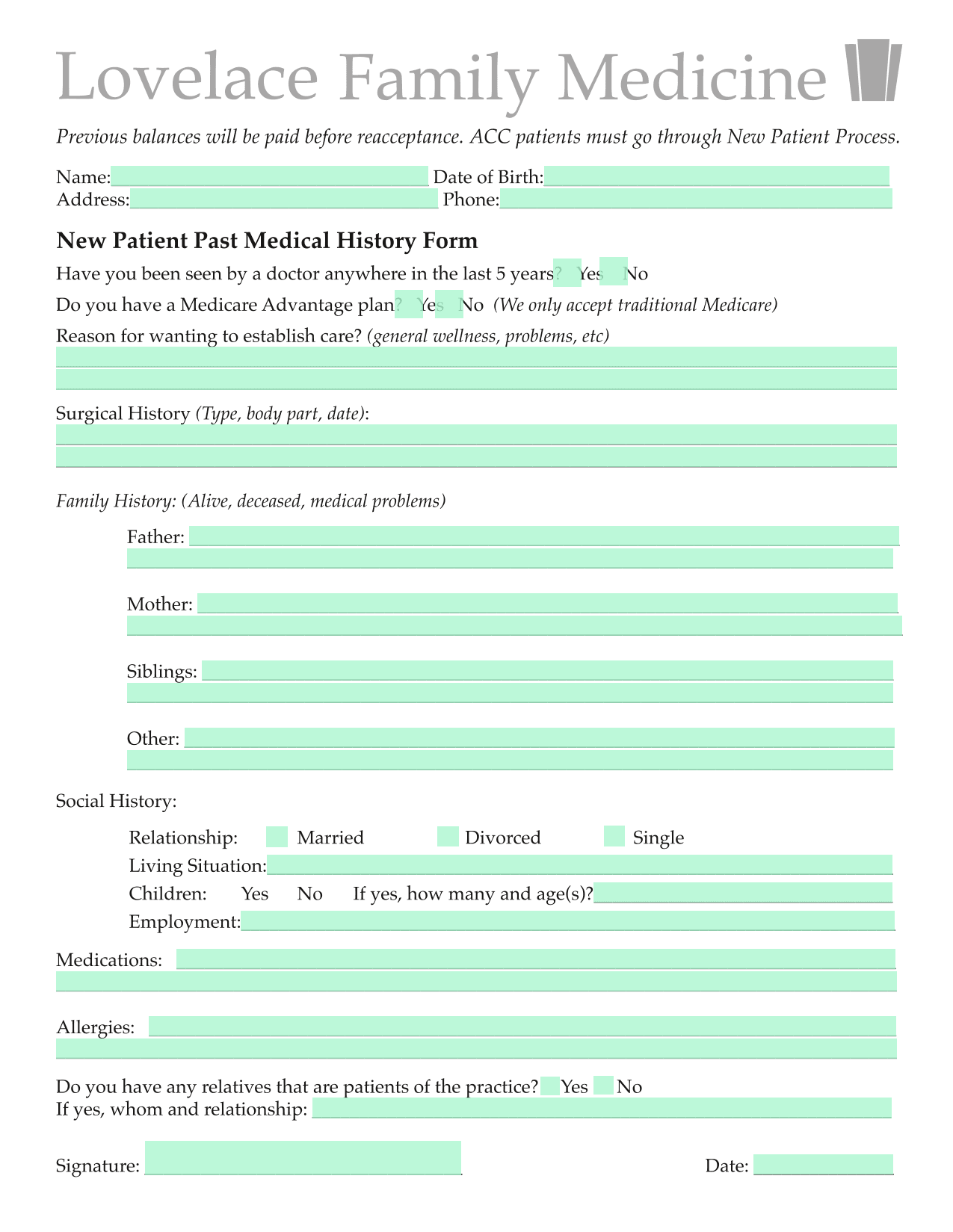 New Patient Past Medical History Form