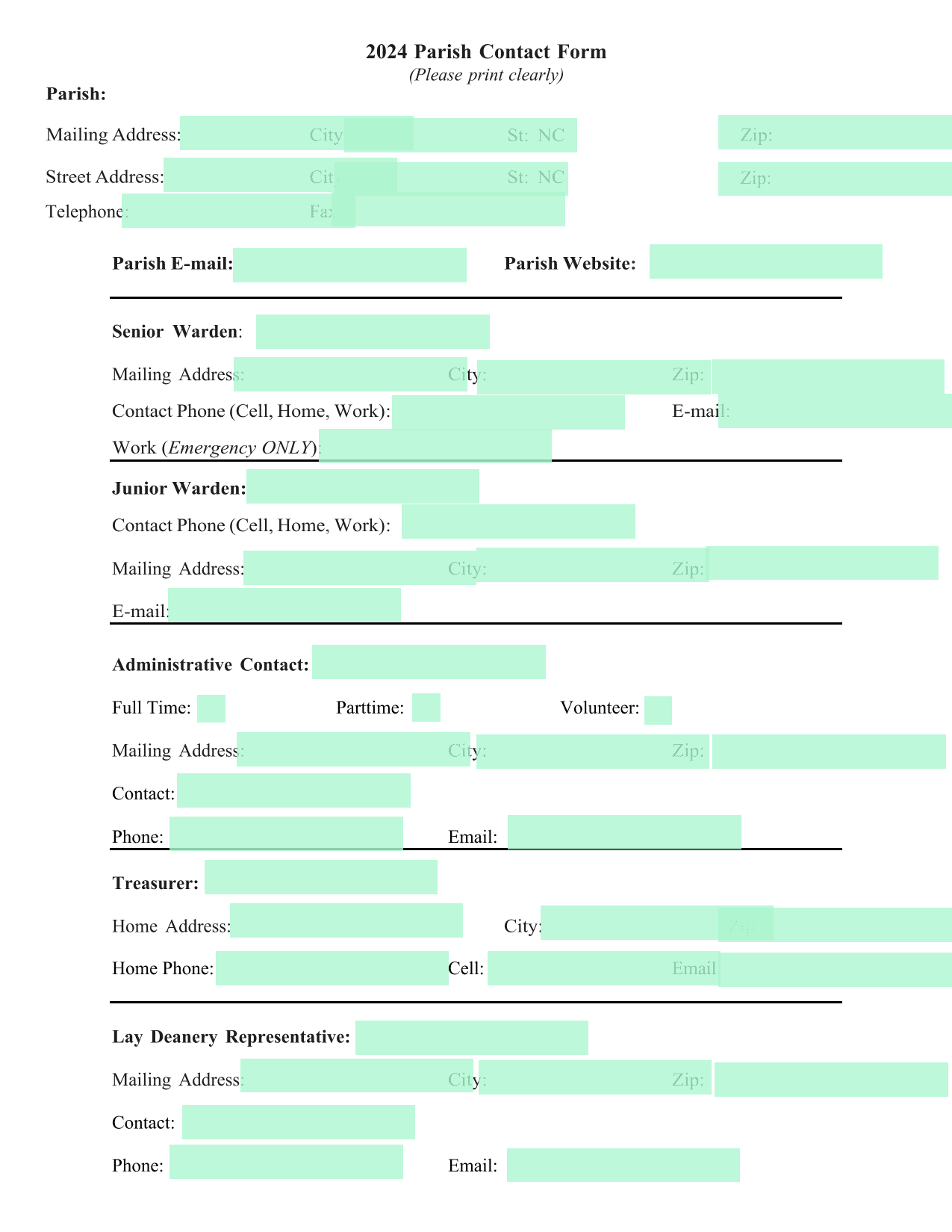 A community competition entry form for multiple activities celebrating the Platinum Jubilee in Trinity Parish, including treasure hunts, hat design, horseshoe decoration, crown making, and cake decorating.