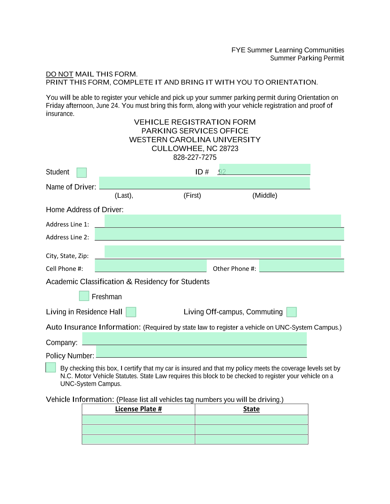 A vehicle registration form for students participating in summer learning communities to obtain a parking permit at Western Carolina University.