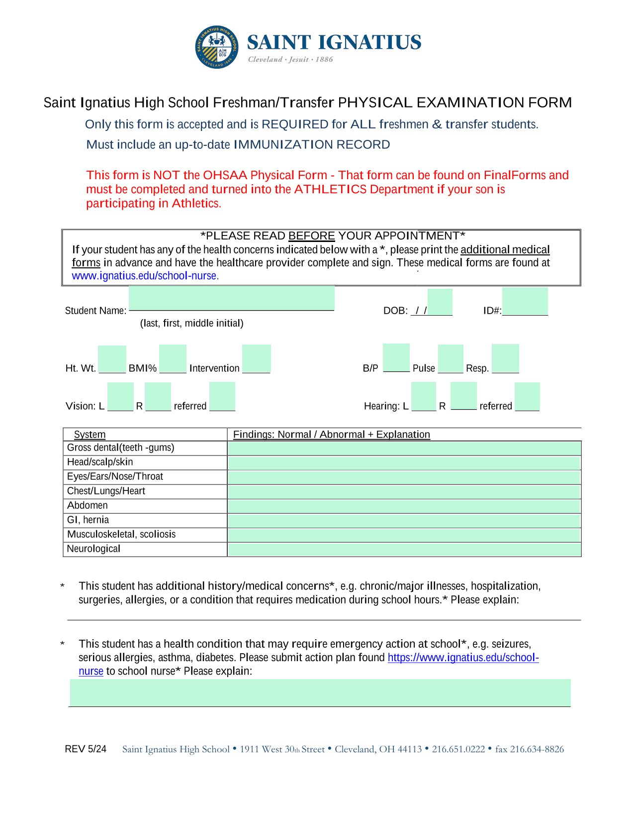 Required medical examination form for freshmen and transfer students at Saint Ignatius High School, including health screening and medical history details.