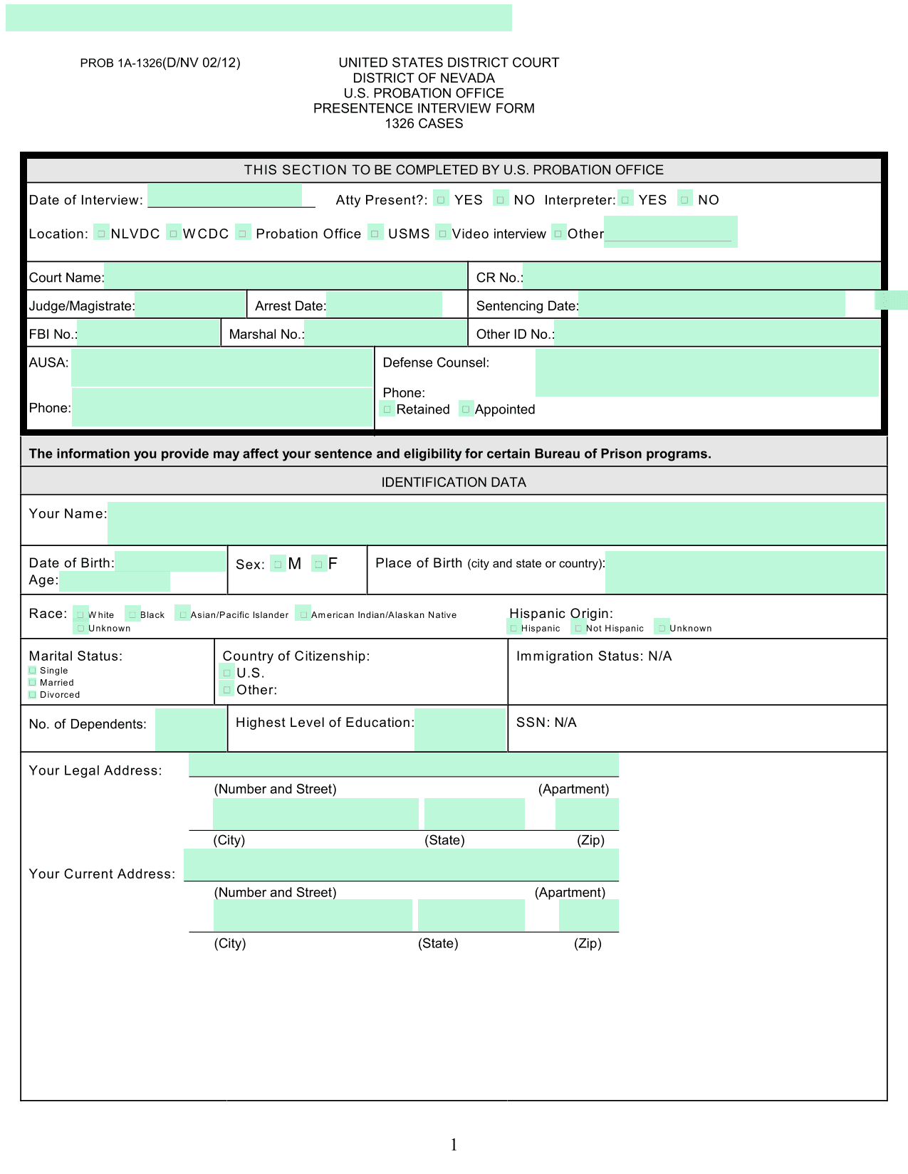Start filling PRESENTENCE INTERVIEW FORM 1326 CASES for free
