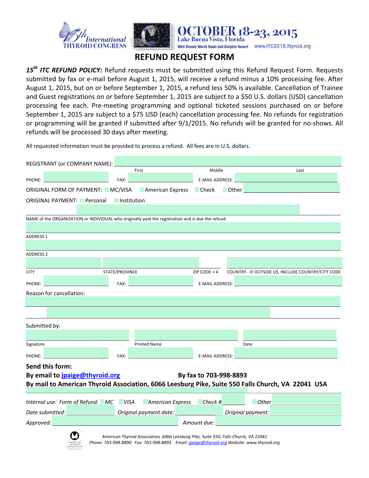 A form for submitting refund requests for conference registrations with specific cancellation and processing fee guidelines.