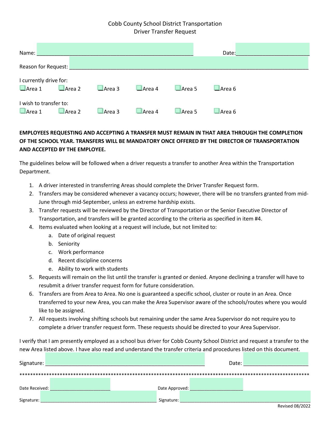 A form for school transportation drivers to request transfer between different service areas within the district's transportation department.