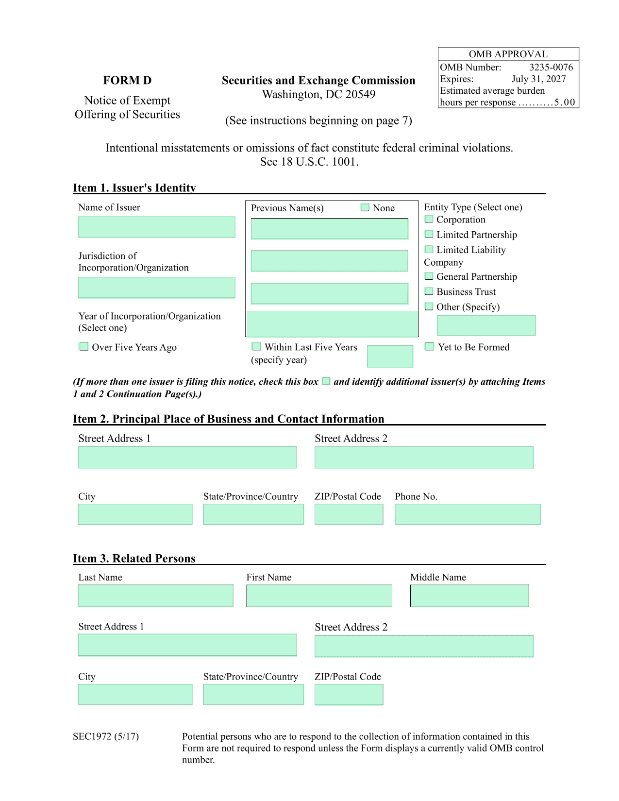 Start filling Form D Notice Of Exempt Offering Of Securities for free