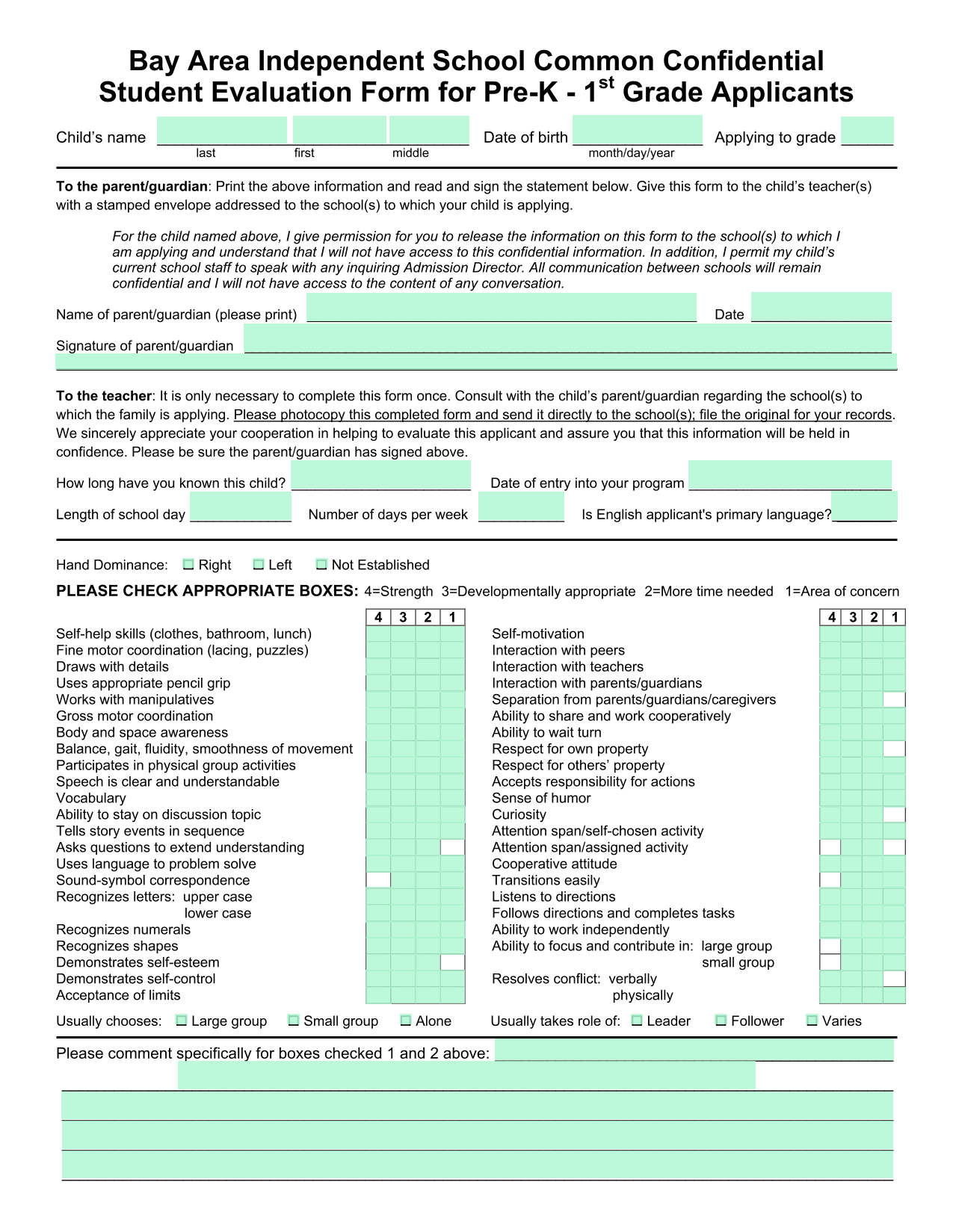 Start filling Bay Area Independent School Confidential Student Evaluation Form For Pre K 1st Grade Applicants for free