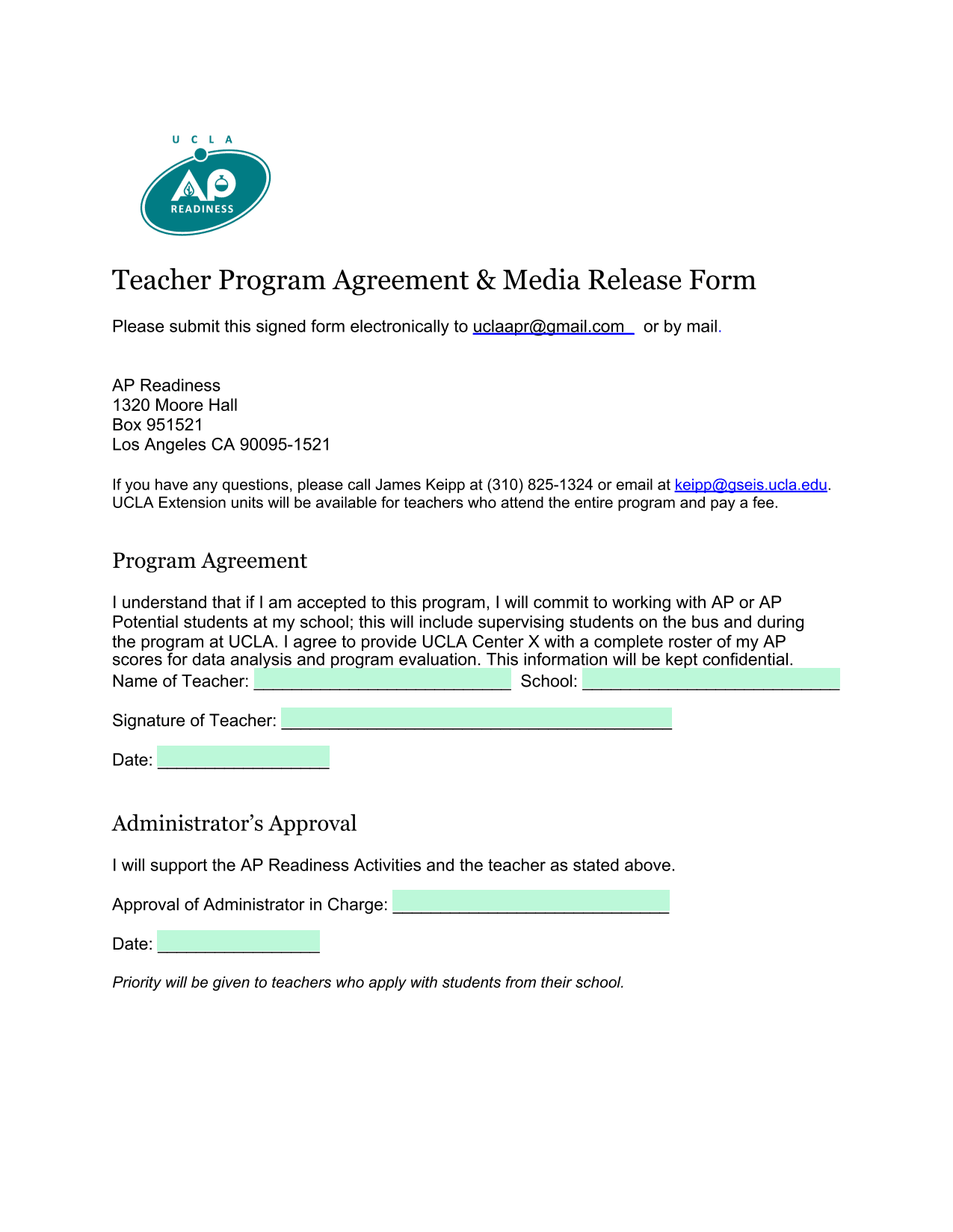 A document for teachers participating in UCLA's AP Readiness Program, including program commitment and media release consent.
